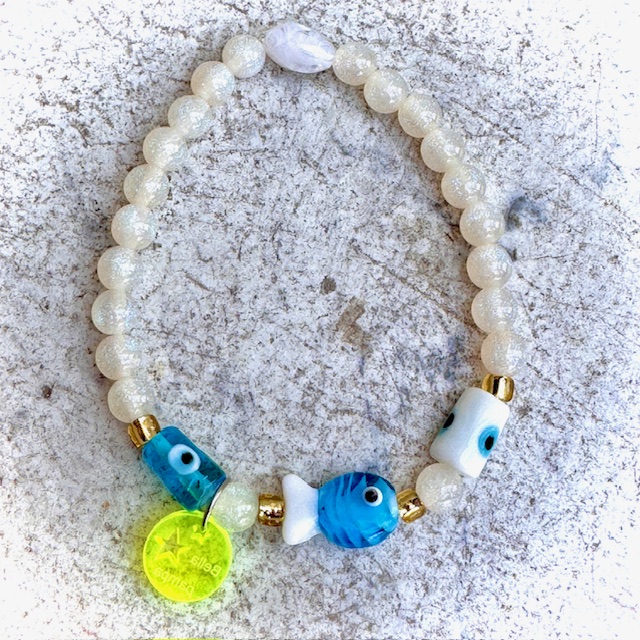 Perles oeil de Murano et poisson en verre, perles blanches et scintillante.