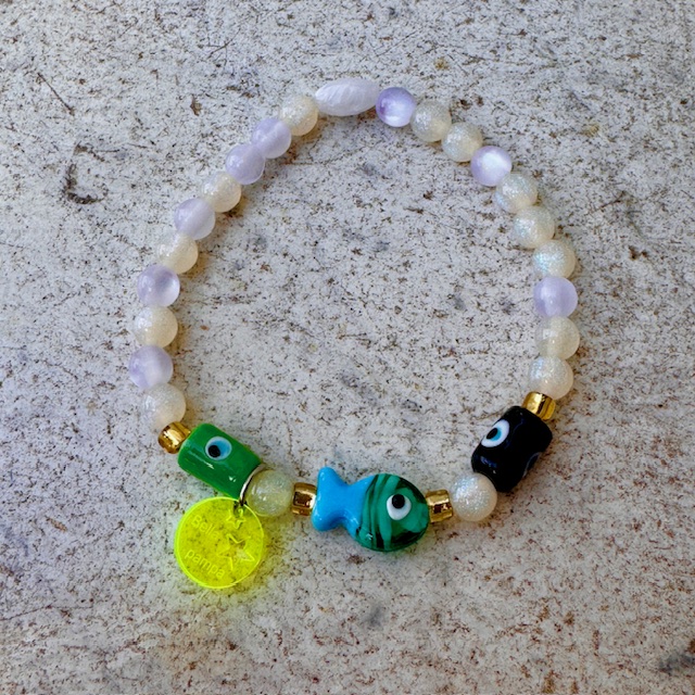 Perles oeil de Murano et poisson en verre, perles blanches et scintillante.