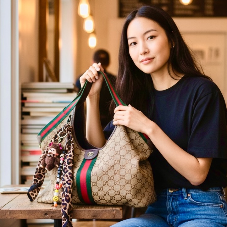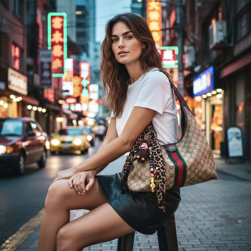 J’aime beaucoup l’idée de le porter sur un panier, cabas, sac de luxe pour un style décalé.