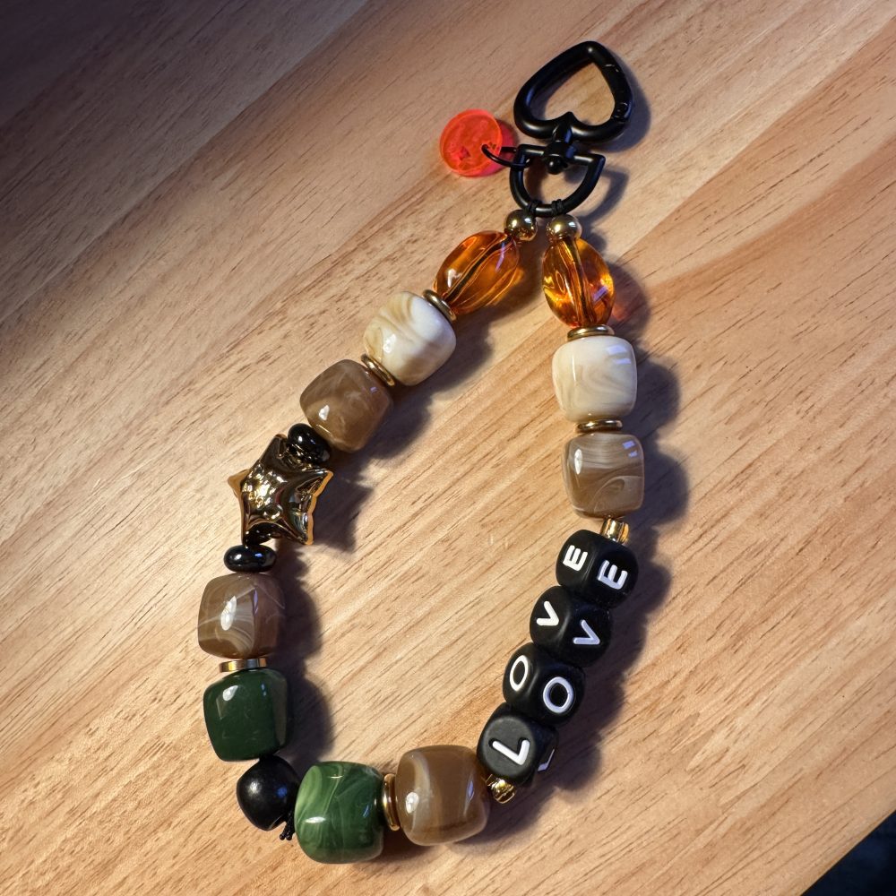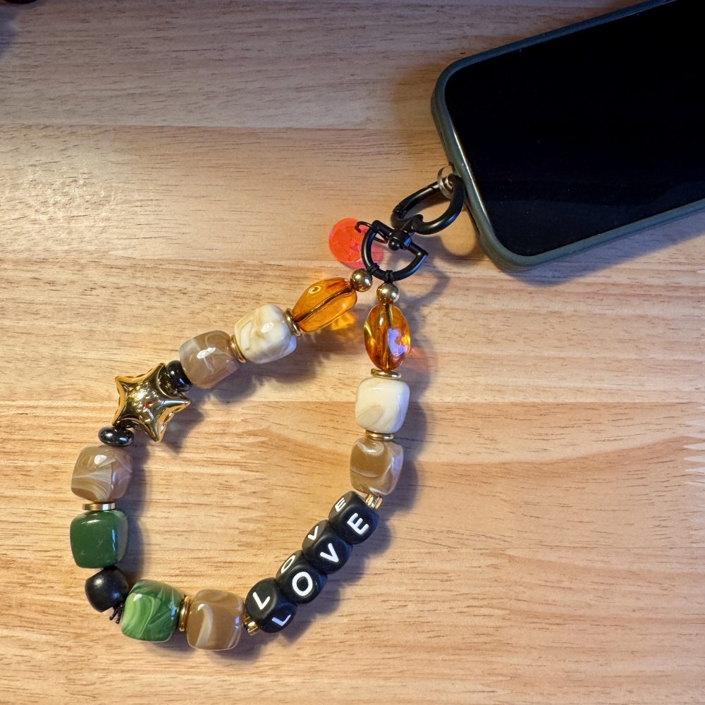 BIJOU DE TÉLÉPHONE ANDREA, GROSSES PERLES, MESSAGE LOVE, ÉTOILE DORÉE GOOD LUCK, PERLES EN ACIER INOXYDABLE DORÉES