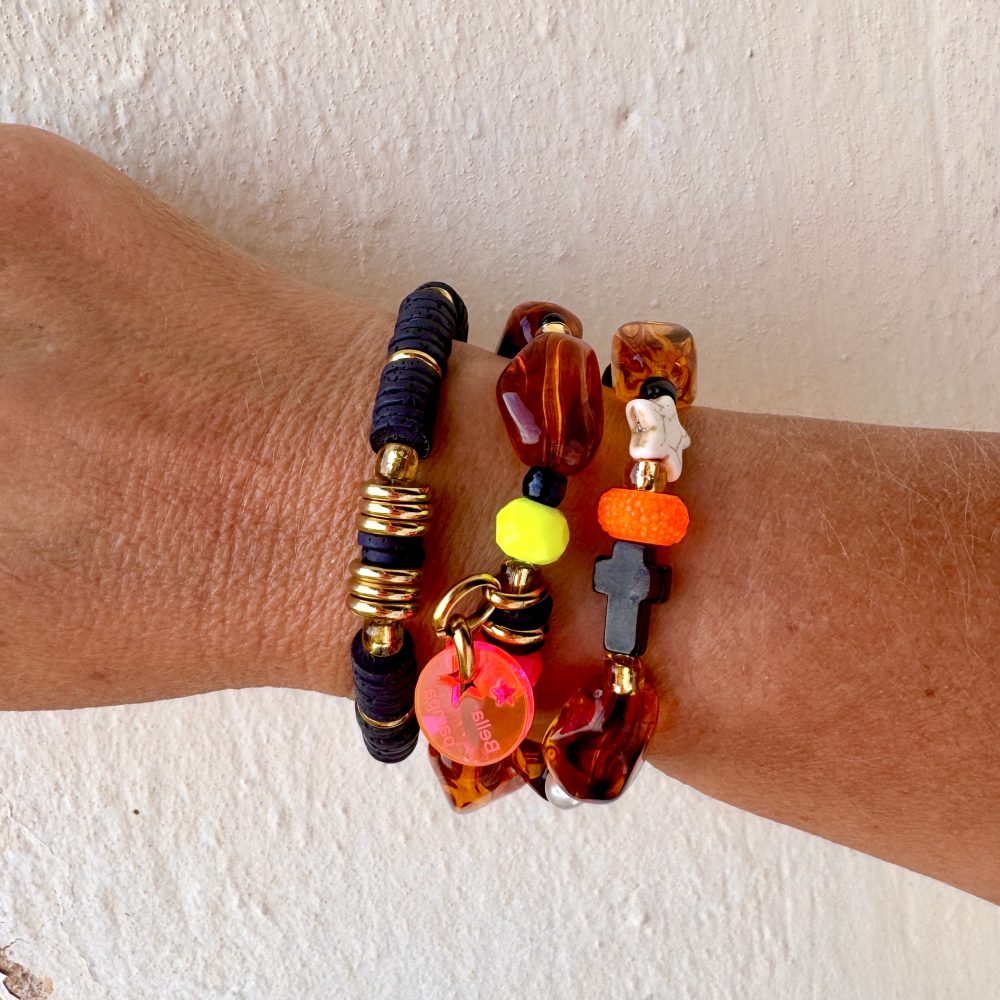 BRACELET ELASTIQUE DOUBLE TOUR STELLA, PERLES COULEUR AMBRE, ÉTOILE, CROIX, PERLES FLUO.