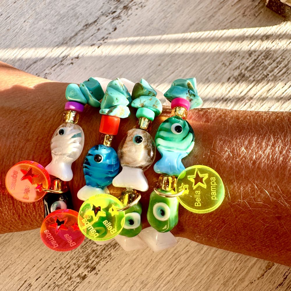 BRACELETS ÉLASTIQUE GASTON, PERLES POISSONS EN VERRE, TURQUOISE, OEIL, PERLES DORÉES ET COLORÉES.