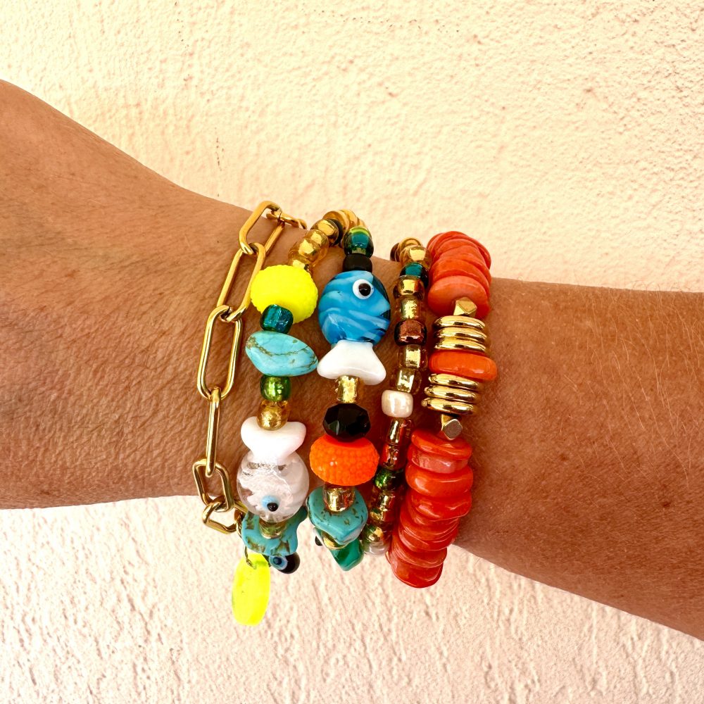 Superbe bracelet nouvelle collection à porter seul ou en superposition avec le bracelet Bracelet élastique Gaston perles poissons, oeil, turquoise.