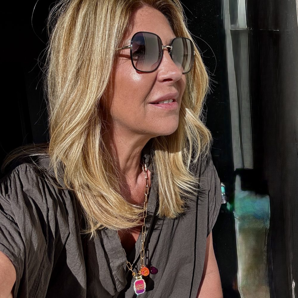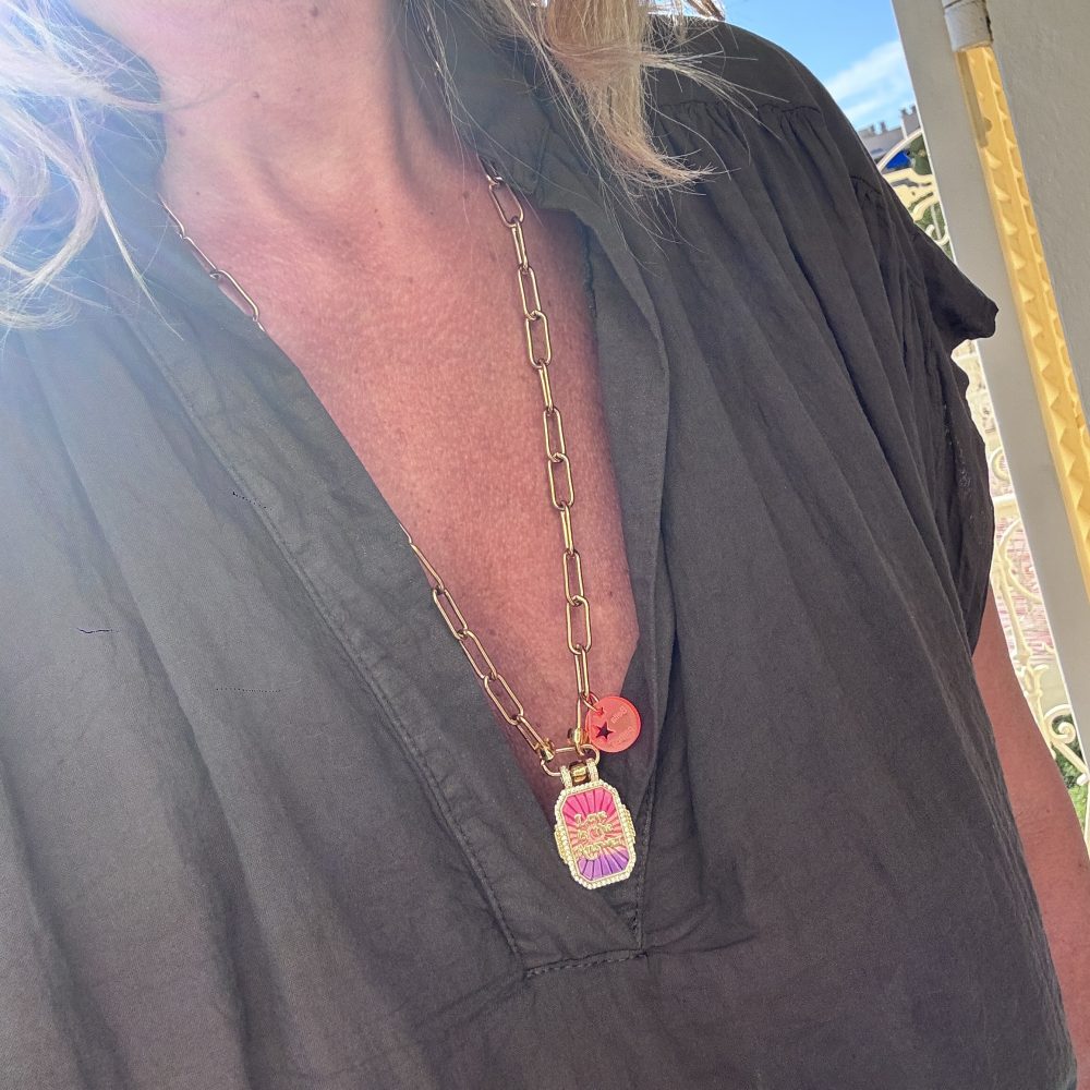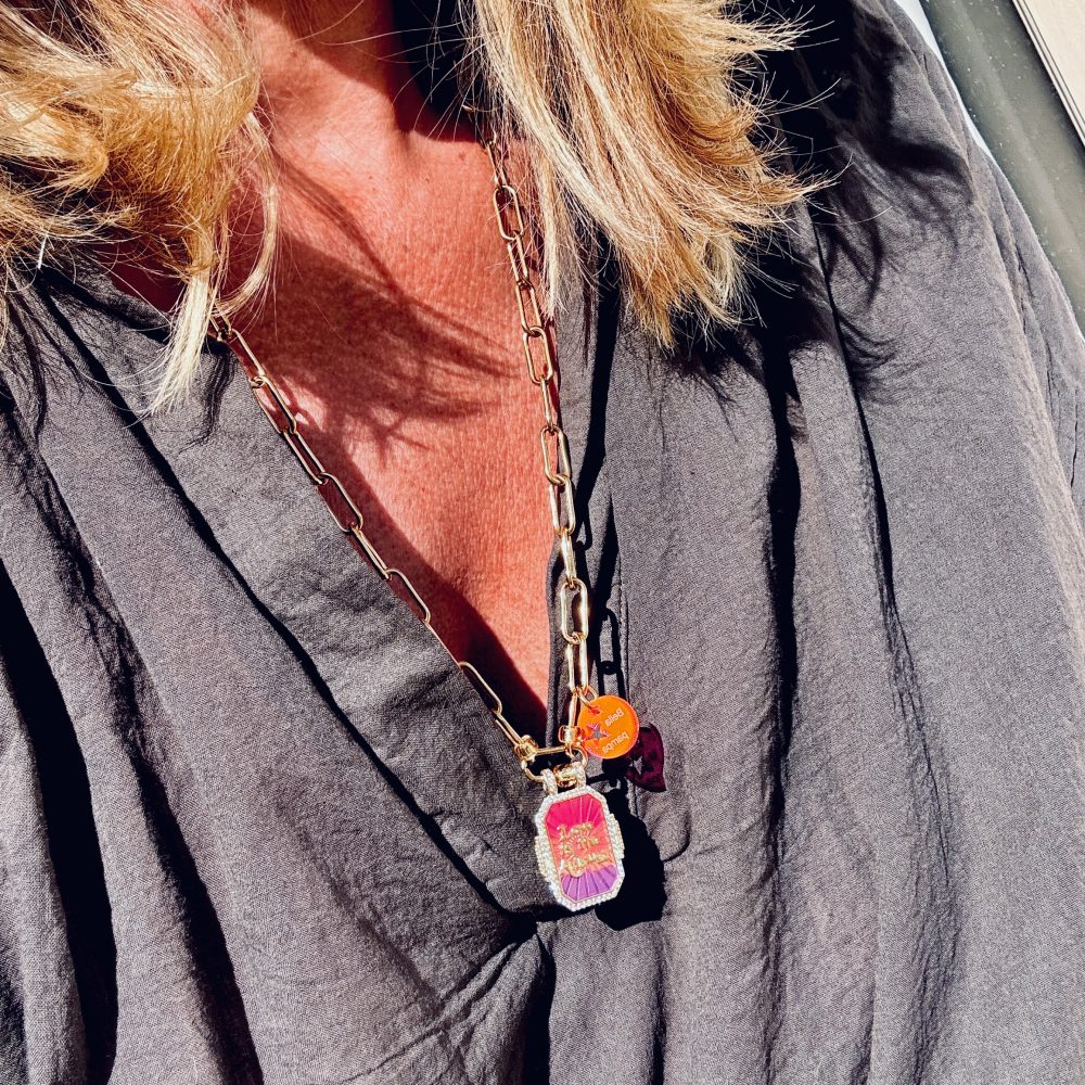 Une chaine en acier inoxydable dorées, des perles en verre dorées, La plaquette message Love in the answer est en plaqué or 18 K, breloque fluo Bella-pampa.