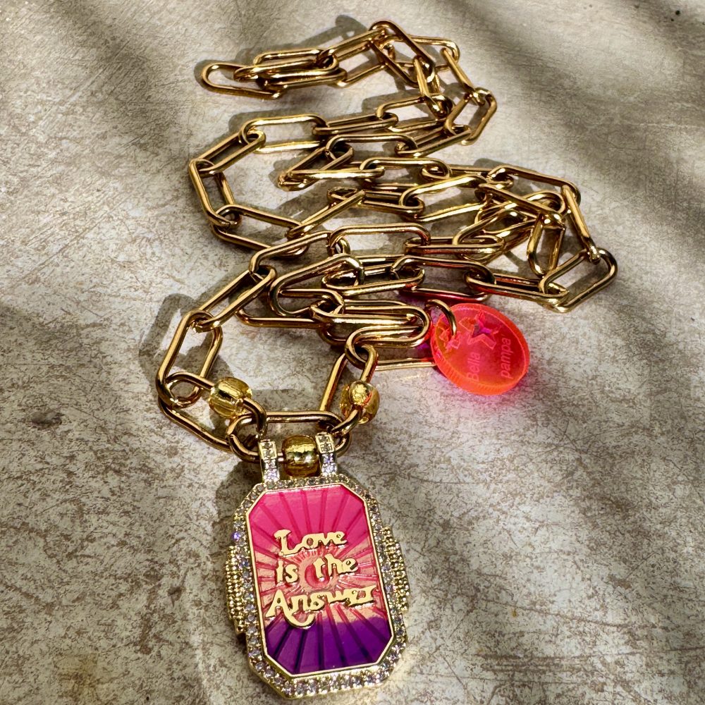 COLLIER LOVE IN THE ANSWER, PENDENTIF COLORÉ ET STRASS, CHAINE EN ACIER INOXYDABLE.