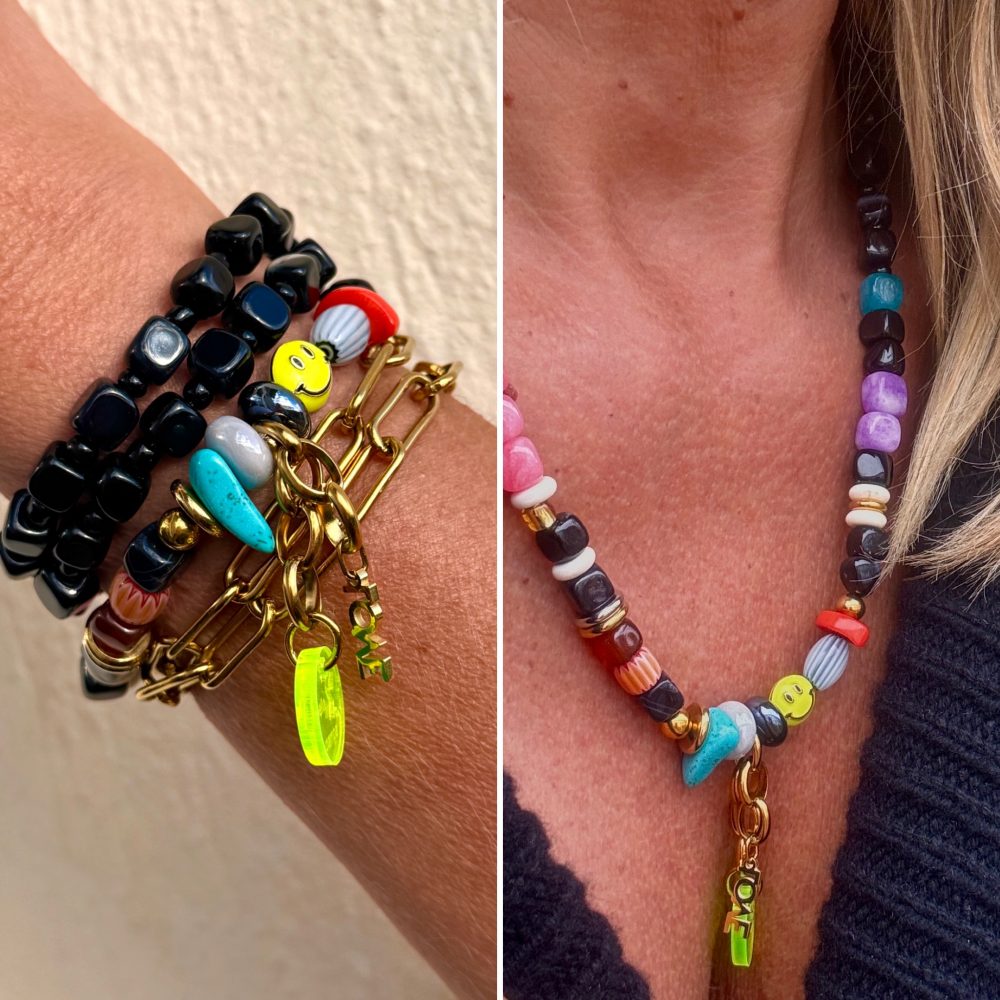 COLLIER OU BRACELET RICK, PERLES COLOREES, CHARM LOVE, SMILEY, TURQUOISE CORAIL, PERLES CUBES.