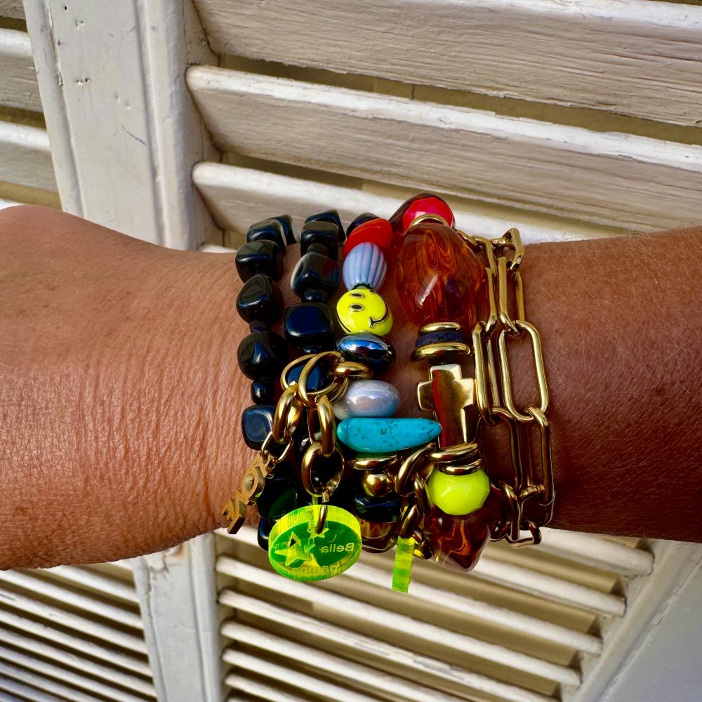 Ou le Bracelet Giusti croix acier inoxydable perles couleur ambre fluo