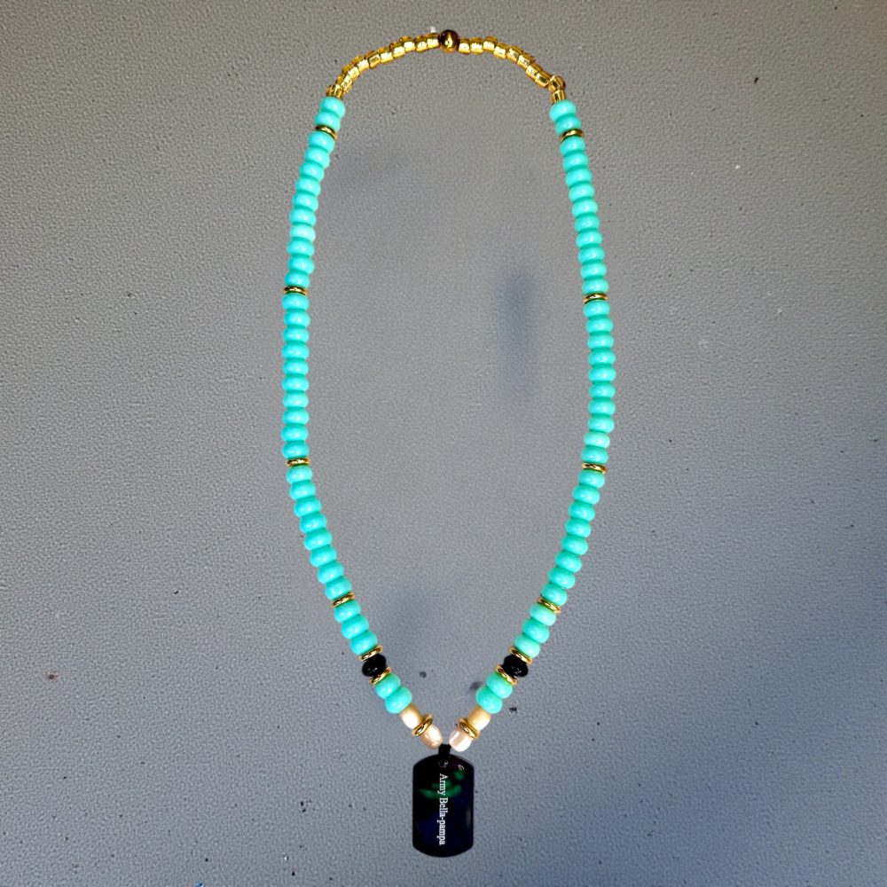COLLIER ÉLASTIQUE VICTOR, PERLES EN VERRE BLEU/CIEL, PLAQUE ARMY BELLA-PAMPA ACIER INOXYDABLE