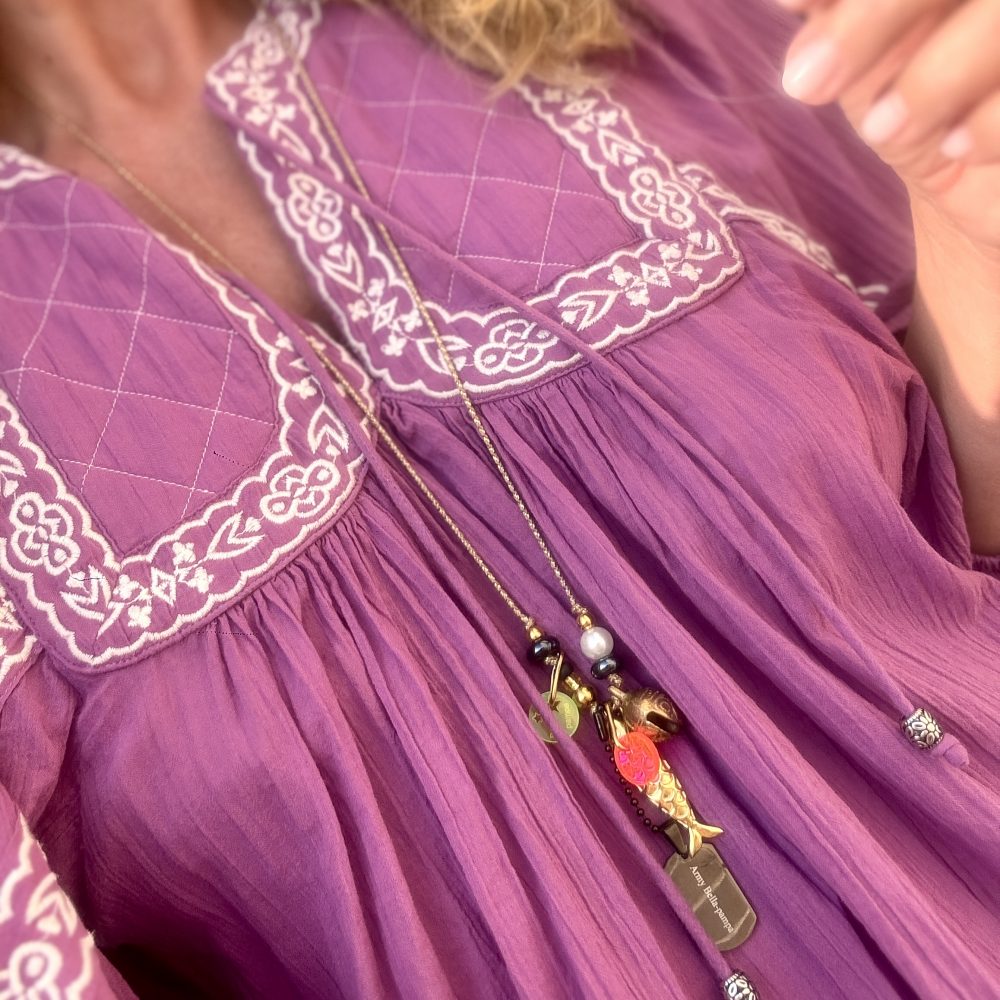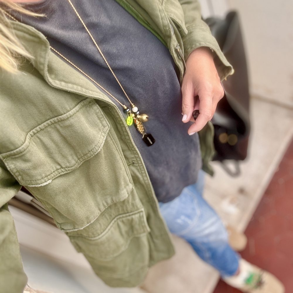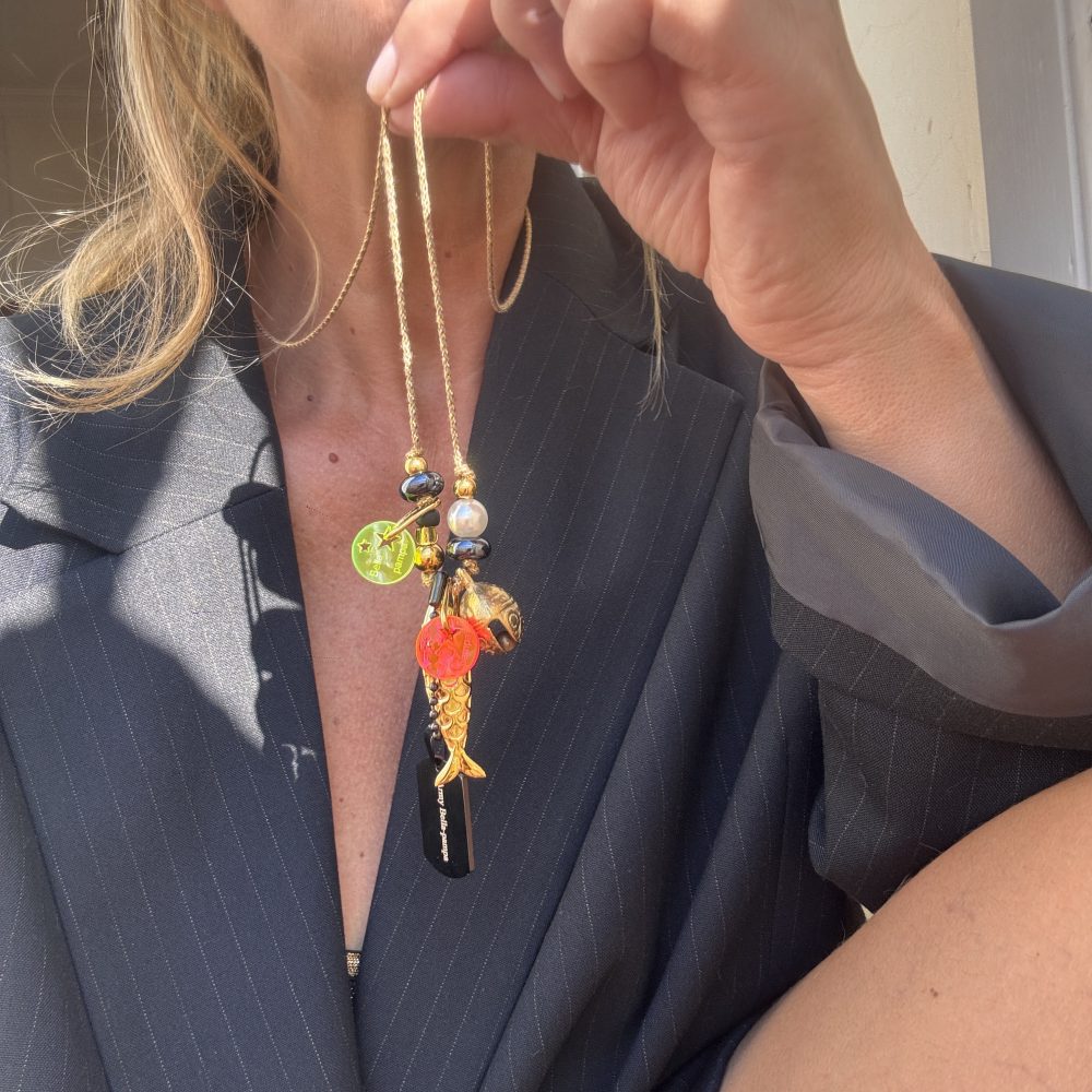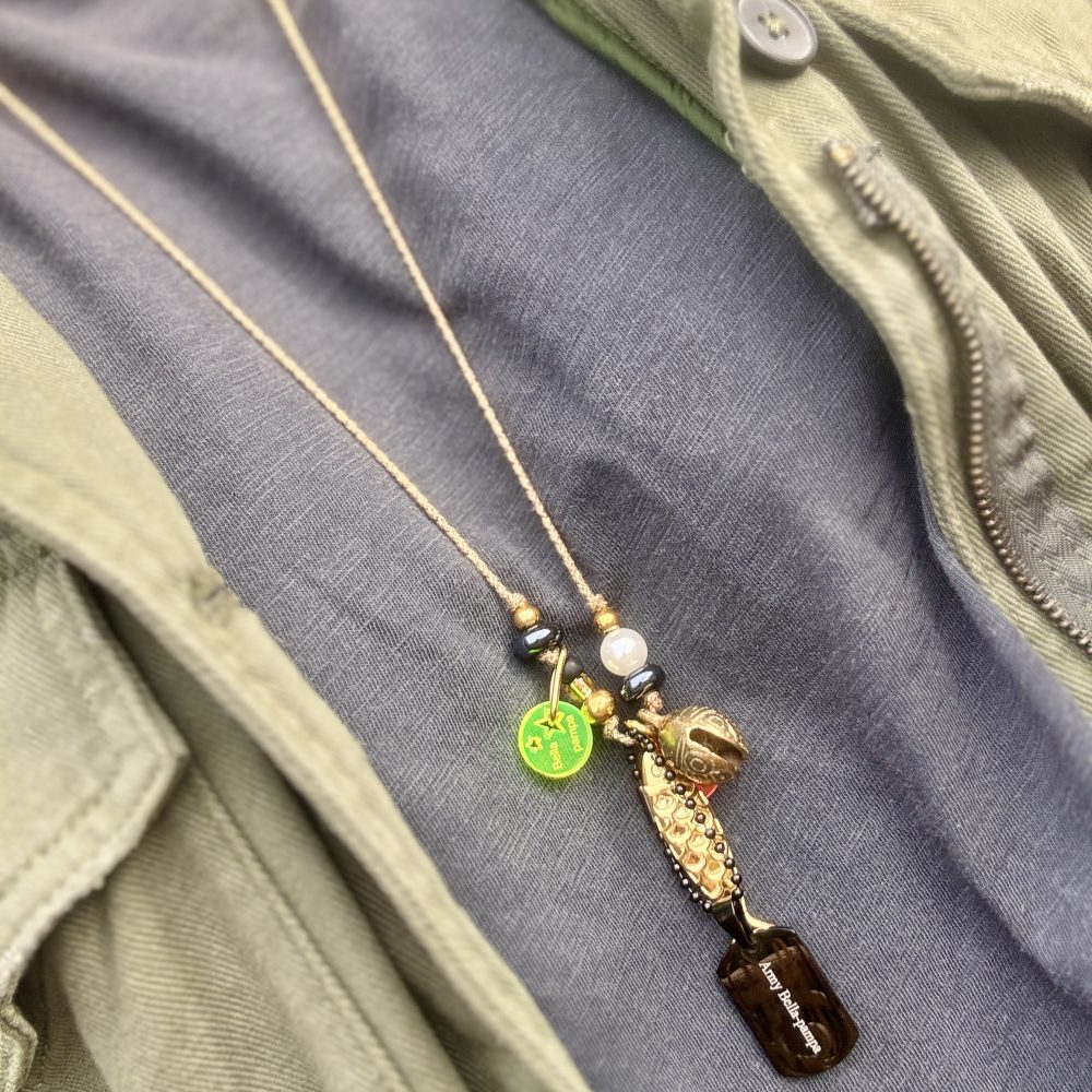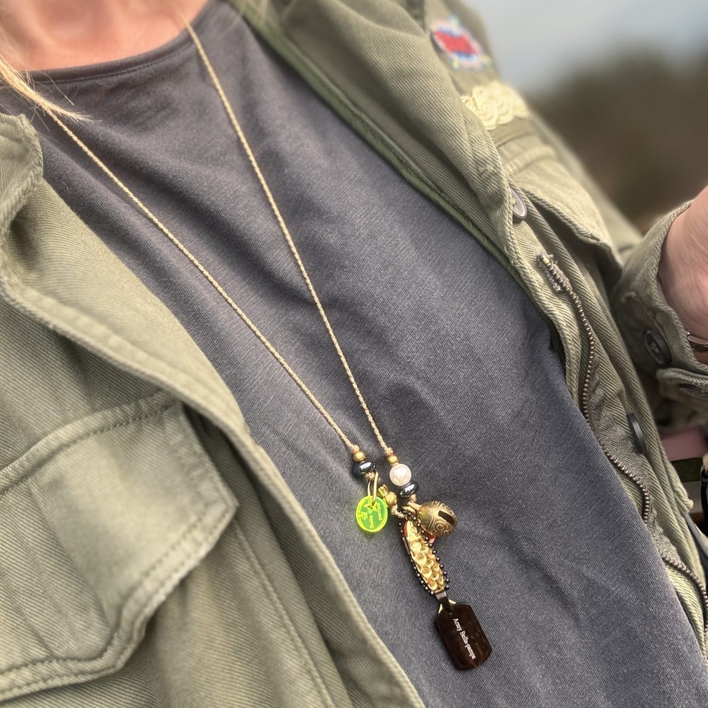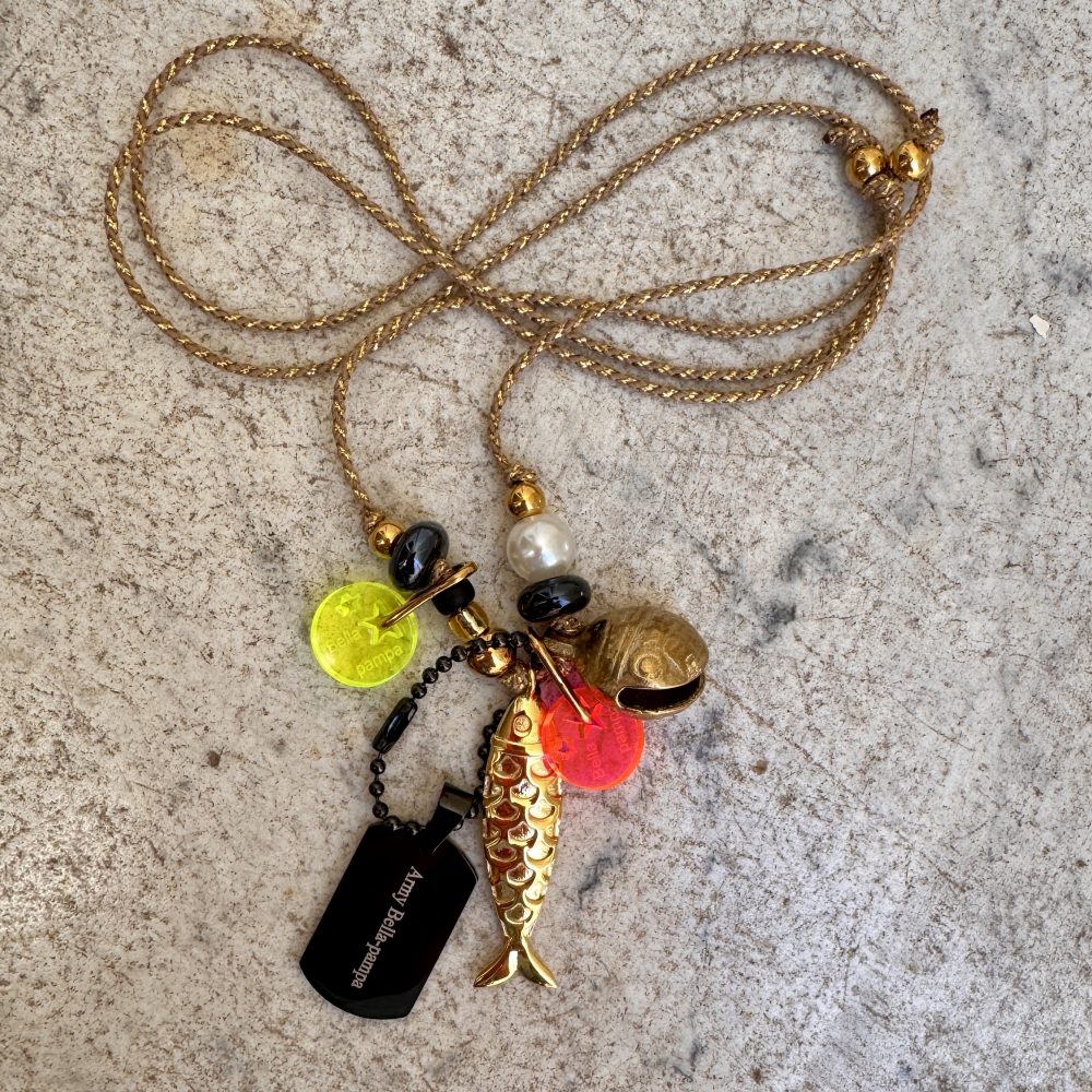 LONG SAUTOIR ANTOINE, GRELOT, PLAQUE ARMY GRAVÉÉ BELLA-PAMPA, POISSON, PERLES.