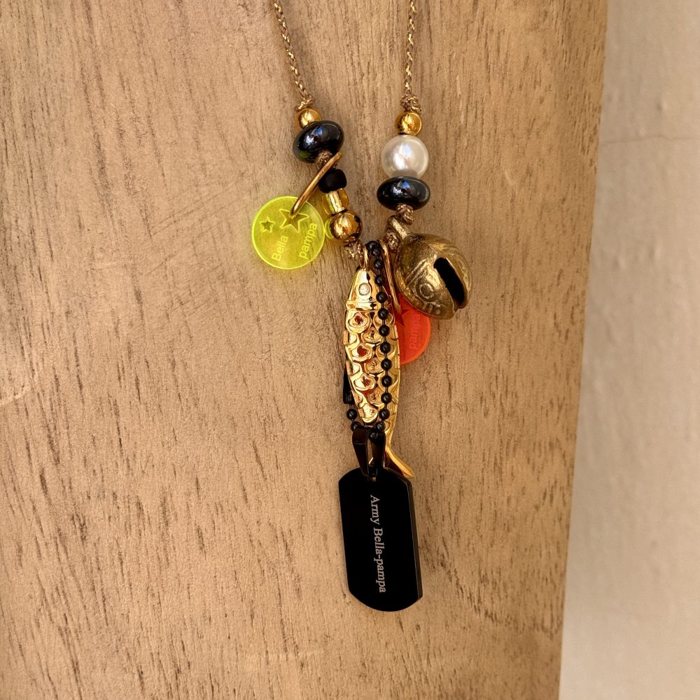Cordon doré, poisson en acier inoxydable, grelot en cuivre, plaque noire gravée Bella-pampa, perles en céramique, perles en acier inoxydable dorées, perle de culture fantaisie.